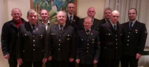 Das Bild zeigt die teilweise neu gewählte Verwaltung im Jubiläumsjahr mit Pfarrer Manfred Ederle(links) der als Notfallseelsorger in die Wehr eintrat. Theo Bäzner (2.v.l.) leitet die Abteilung im Jubiläumsjahr. Bürgermeisterstellvertreter Horst Reiser(3. v. l.) gratulierte im Namen der Gemeinde. Der Gesamtfeuerwehrkommandant Martin Irion(rechts) hat für dieses Jahr seinen Rücktritt angekündigt.