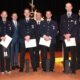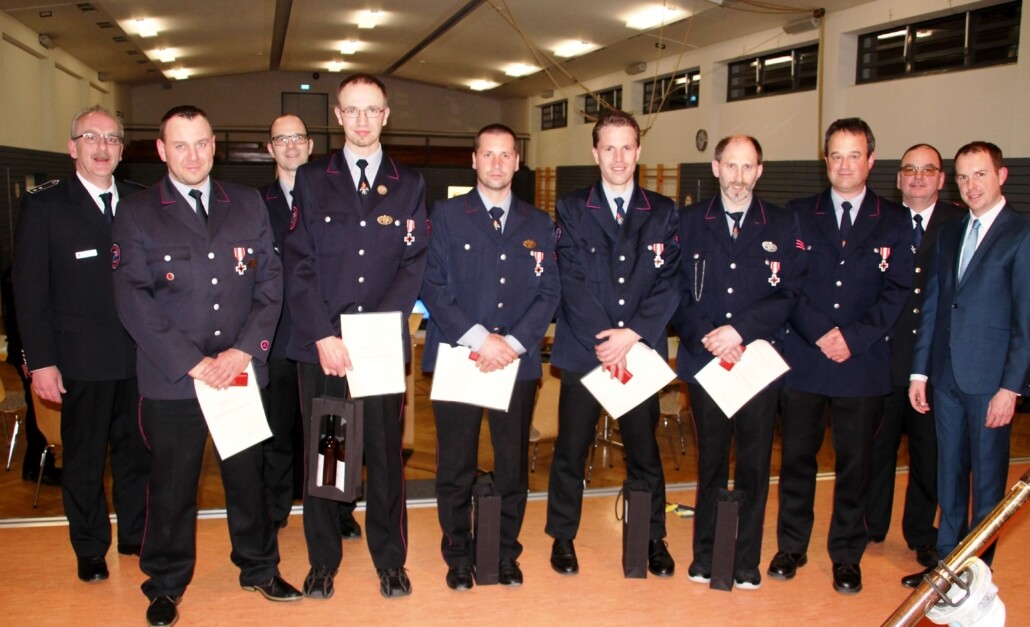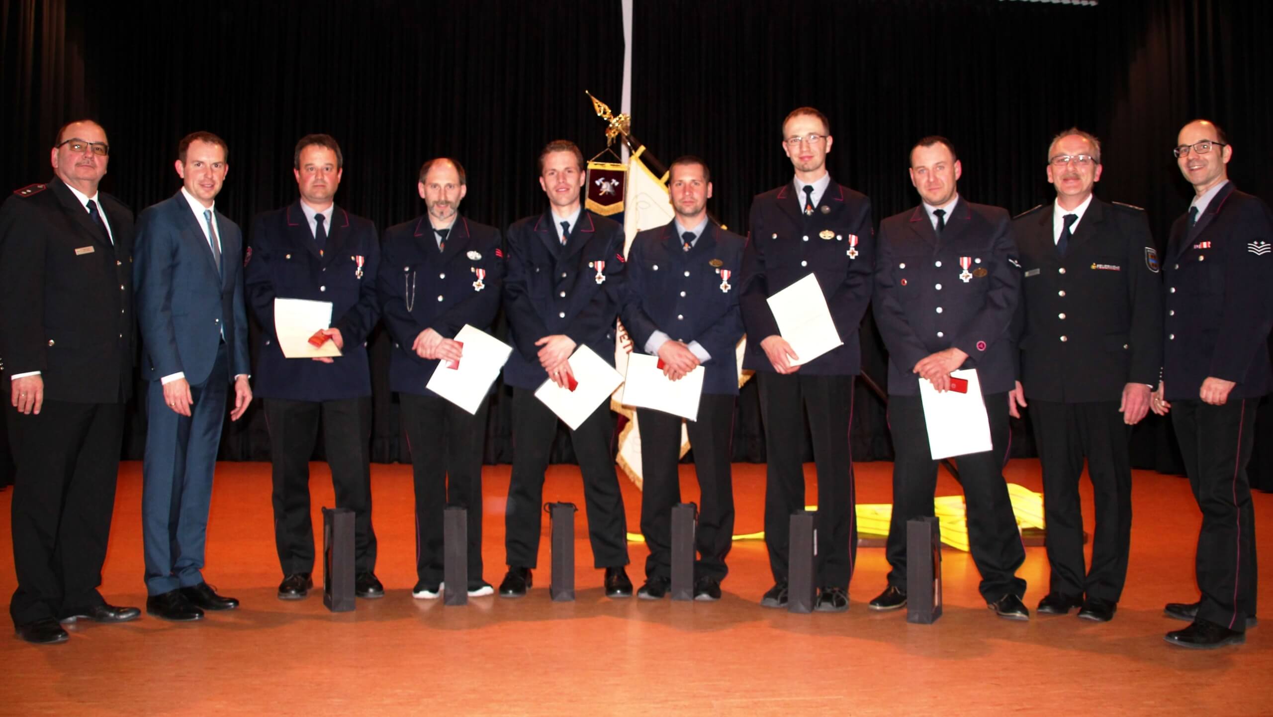 Die für 25 Jahre aktiven Dienst geehrten Feuerwehrkameraden vorn von links: Frank Aberle, Markus Augenstein, Andreas Faaß, Sebastian Gille, Marco Schlegel und Jochen Treiber. Dahinter links stv. Kreisbrandmeister Manfred Wankmüller sowie der Straubenhardter Kommandant Martin Irion sowie rechts außen stv. Verbandsvorsitzender Martin Gerst und Bürgermeister Helge Viehweg.