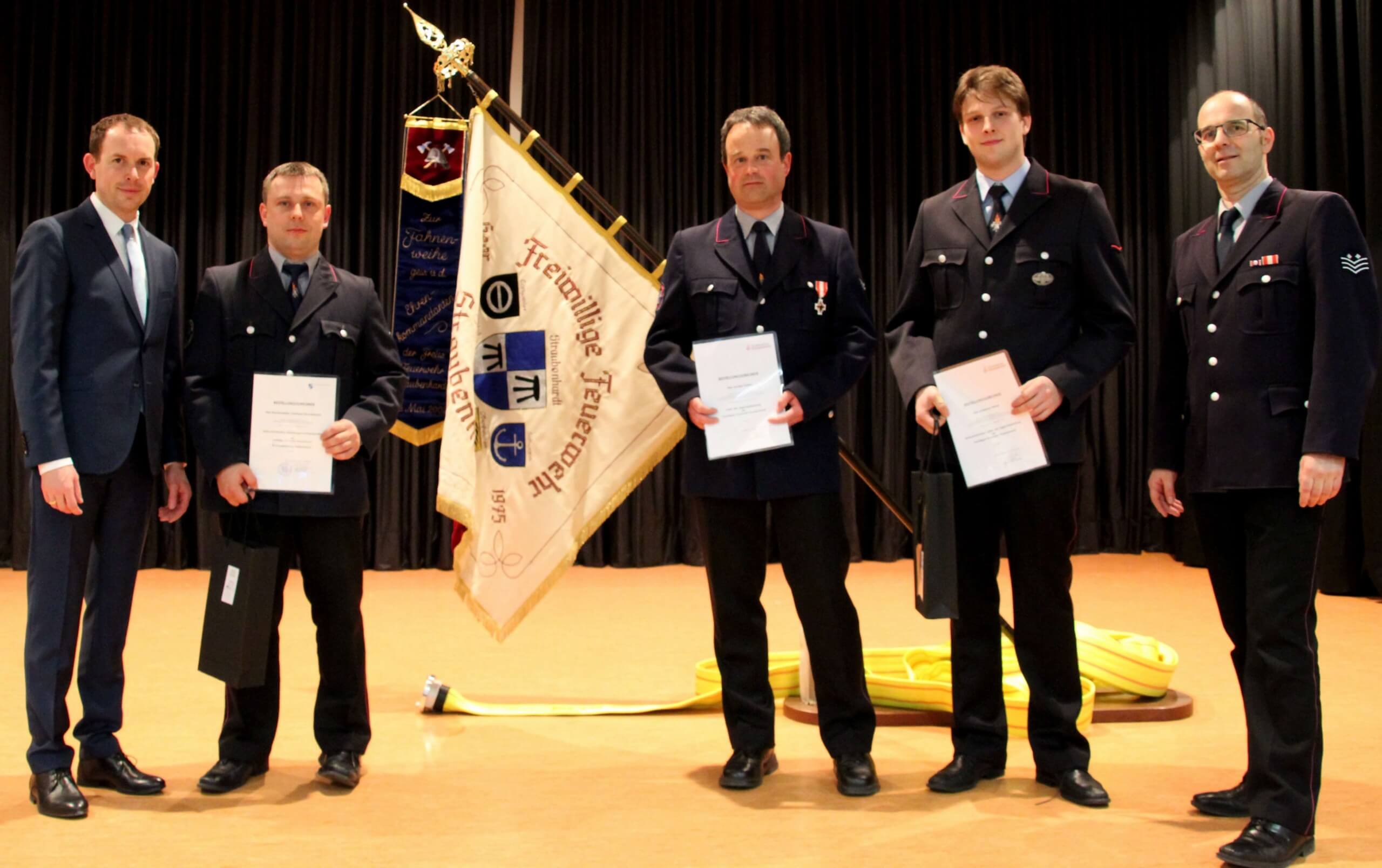 Die Bilanz kann sich sehen lassen: 123 Aktive in sechs Abteilungen, sechzehn Jugendliche, 43 Alterskameraden und achtzehn Mitglieder im Fanfarenzug, der auch den musikalischen Einstieg in die von der Abteilung Conweiler bewirtete Jahresversammlung der Straubenhardter Feuerwehr gestaltete. Martin Irion, hauptamtlicher Kommandant, berichtete weiterhin von 76 Einsätzen in großer Bandbreite, von Mittelbränden über technische Hilfeleistungen von Verkehrsunfällen bis Gewässerverunreinigung sowie von Sicherheitswachdiensten, allen voran beim Happiness-Festival, welches Irion ausdrücklich als durchweg positiv herausstellte. Hinzu kamen im Feuerwehrjahr 2016 gemeinde- und organisationsübergreifende Übungen sowie viele Planungsstunden in den Arbeitsgruppen zur Organisation und Gestaltung der künftigen gemeinsamen Straubenhardter Wehr. Schriftführer Robin Geisert berichtete von Ausschusssitzungen und Infoveranstaltungen, Rechnungsführer Rüdiger Neuweiler über die Zahlen des Feuerwehrjahres, welches eine vierstellige Rücklagenzuführung zuließ. Jugendleiter Jochen Treiber zeigte in Wort – und sein mit Lob bedachter Stellvertreter Johannes Reiser in Bildern – das Jugend-Feuerwehrjahr vom interkommunalen Zeltlager zum 25jährigen Jubiläum bis zum erfreulichen Wechsel von drei Jugendwehrlern zu den Aktiven. Neue Jugendsprecher sind Leon Gehrke und Benedikt Jung. Dank ging an den scheidenden stellvertretenden Jugendleiter Markus Kraft.