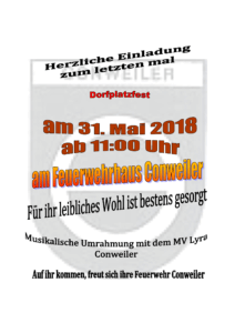 Die Abteilung Conweiler lädt die Bevölkerung herzlich zum Dorfplatzfest am 26. Mai ein. Beginn am Feuerwehrhaus Conweiler ist um 11 Uhr.