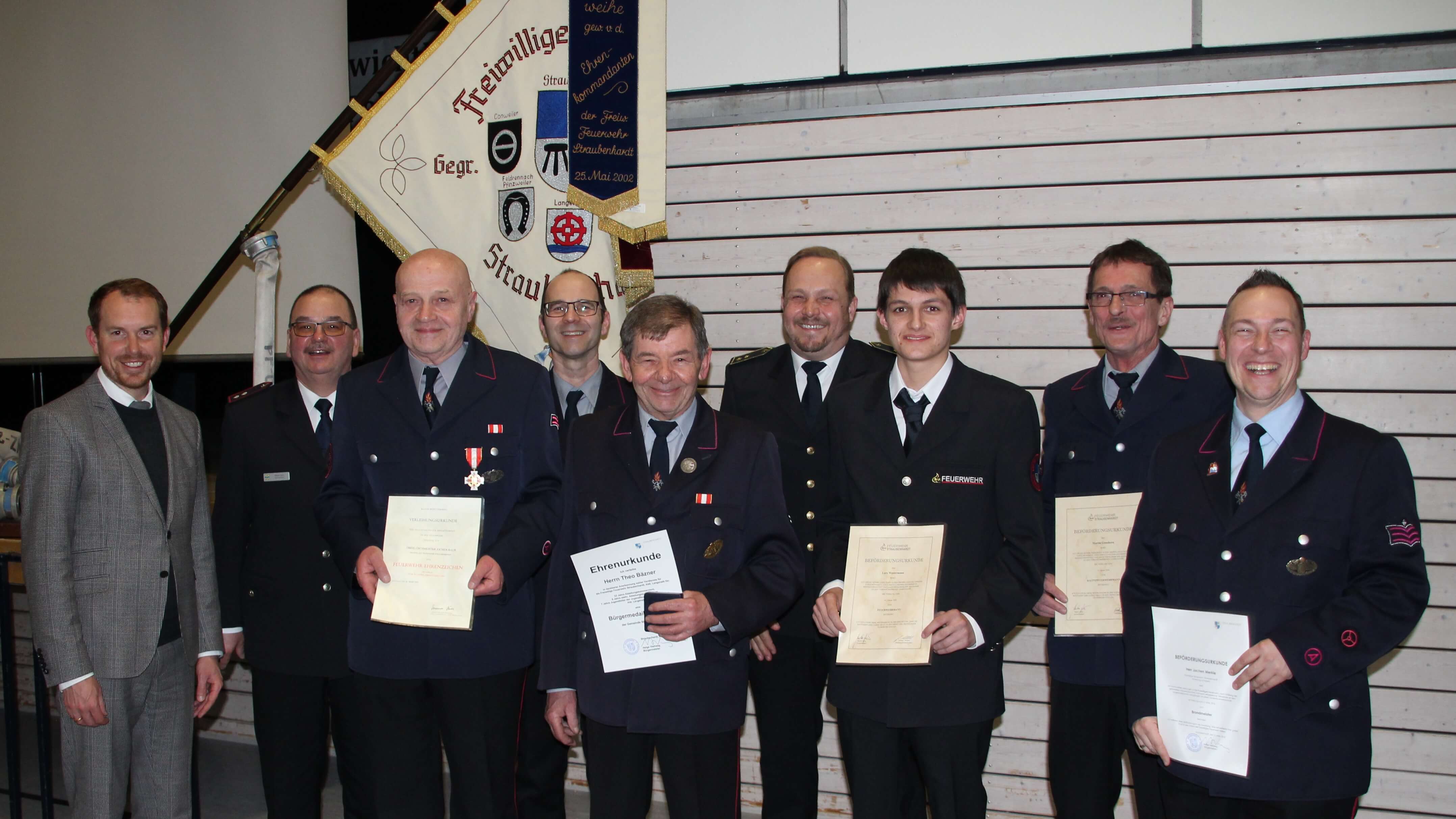 Die Freiwillige Feuerwehr Straubenhardt hatte zu ihrer Jahreshauptversammlung in die Turn-und Festhalle nach Langenalb eingeladen. Der Fanfarenzug Schwann begrüßte die Gäste mit einem musikalischen Gruß. Das beherrschende Thema des Abends: Die Zusammenlegung der 6 örtlichen Wehren, der Neubau des Feuerwehrgerätehauses und die Förderung und Weiterentwicklung der Jugendfeuerwehr. Unter dem Motto „aus 6 mach 1 wir wachsen zusammen“ hat die Wehr große Aufgaben zu bewältigen, bzw. hat sie schon gemeistert. Mit 126 Einsätzen war man im abgelaufenen Jahr enorm gefordert.